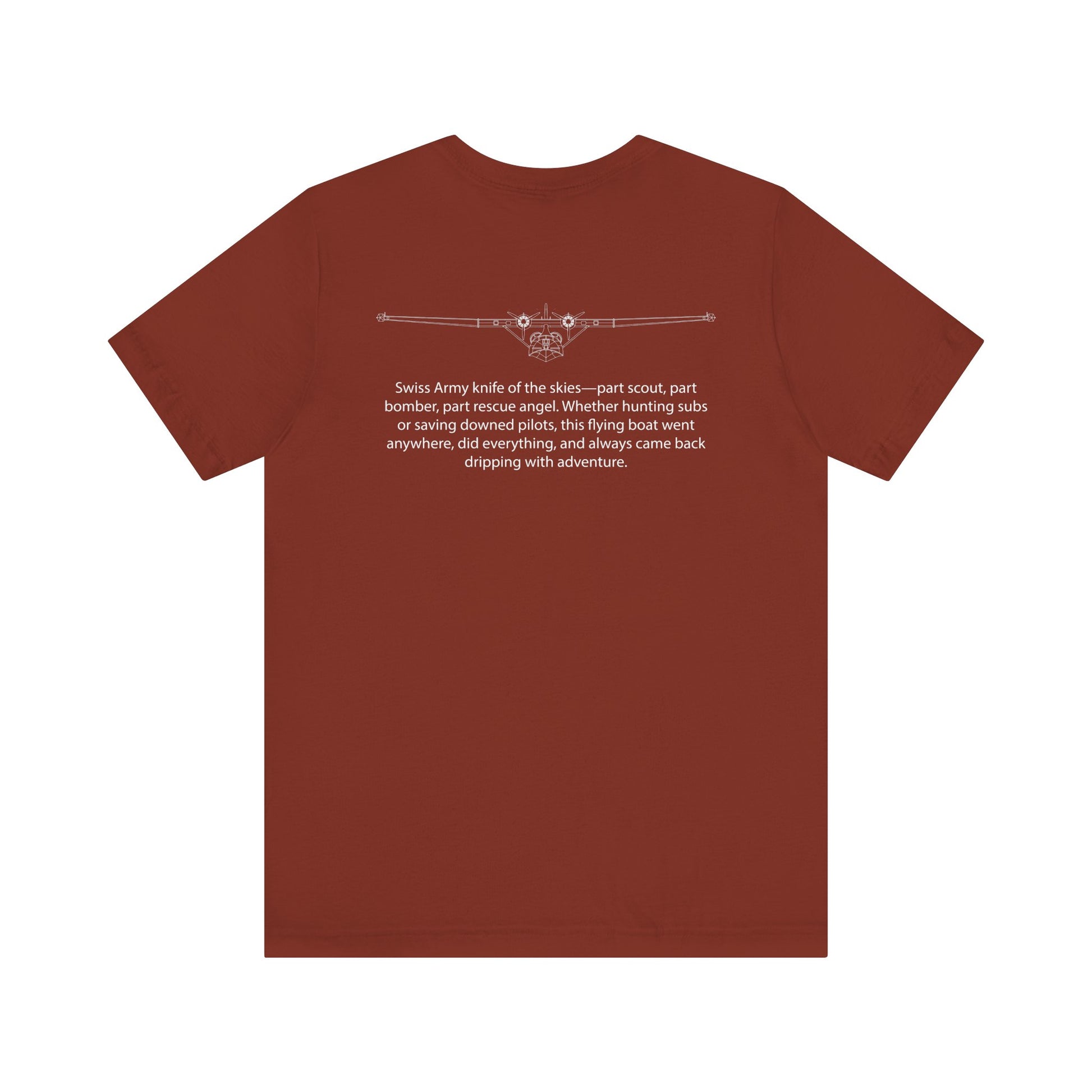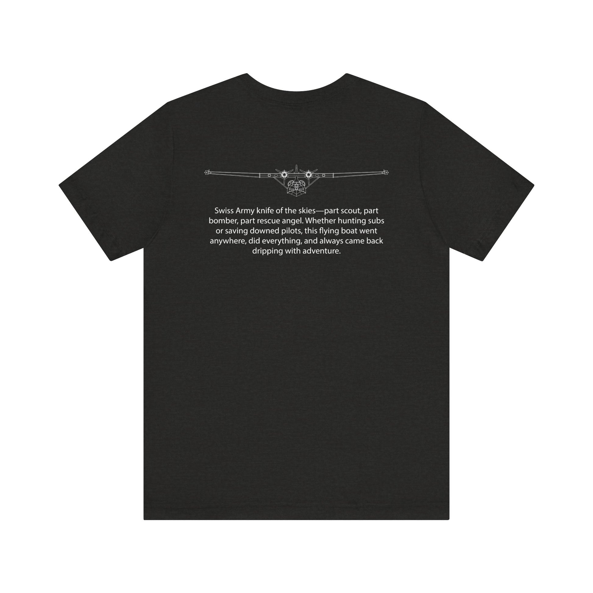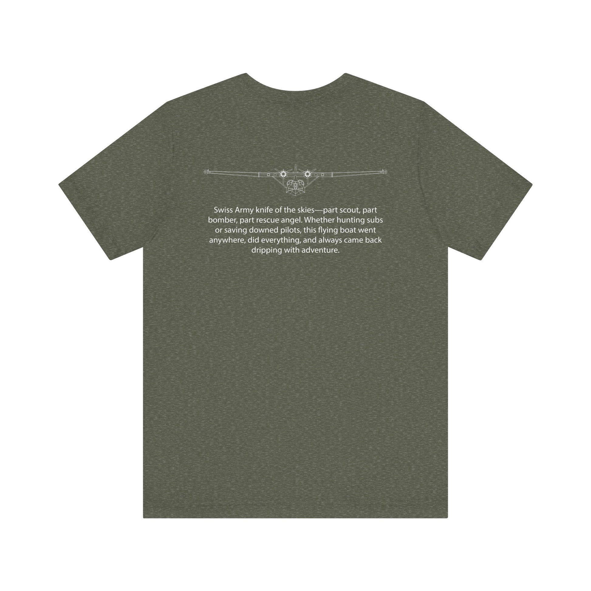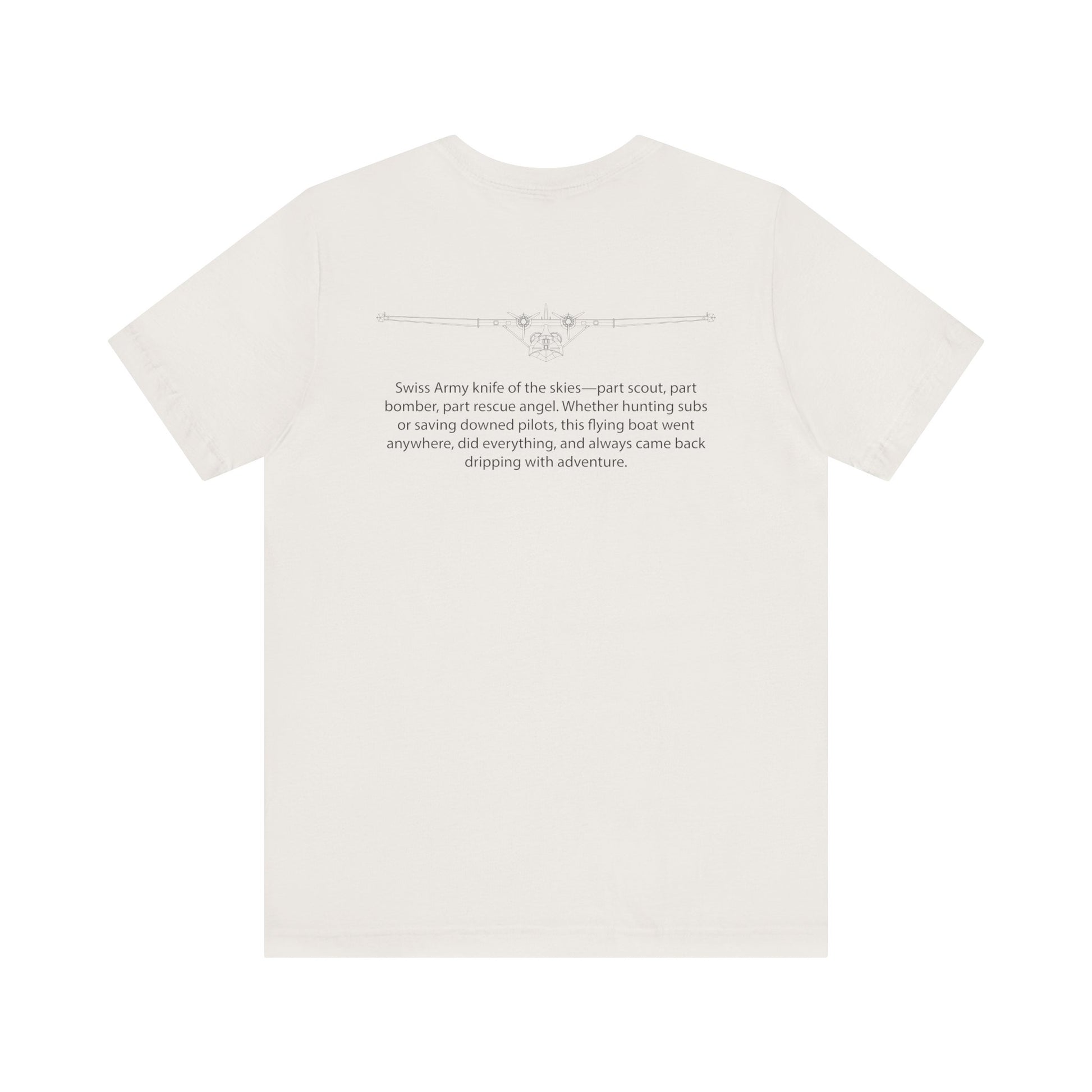 The PBY Catalina: part flying boat, part guardian angel, all legend. Slow? Sure. Glamorous? Not quite. But this big bird rescued downed airmen, hunted submarines, and flew recon missions that changed the game. It snoozed on the waves, soared through the skies, and somehow always showed up exactly when needed. From the Pacific to the Atlantic, the Catalina was the war’s trusty lifeguard and silent scout. This tee honors the unsinkable spirit of the PBY—humble, heroic, and just weird enough to be unforgettable. Because not all warbirds drop bombs—some drop hope, one splash landing at a time.