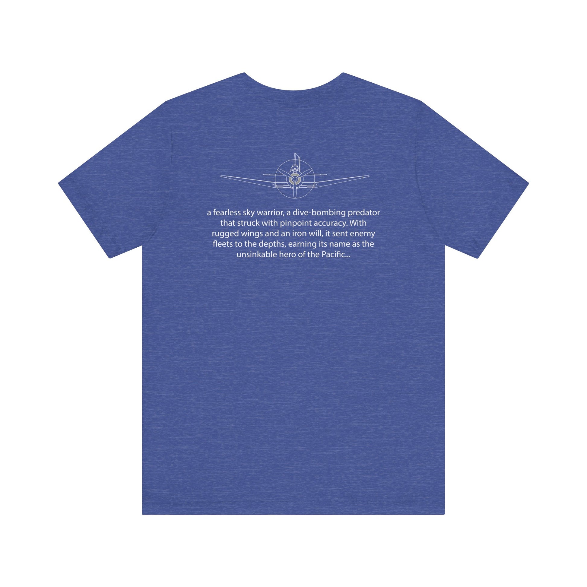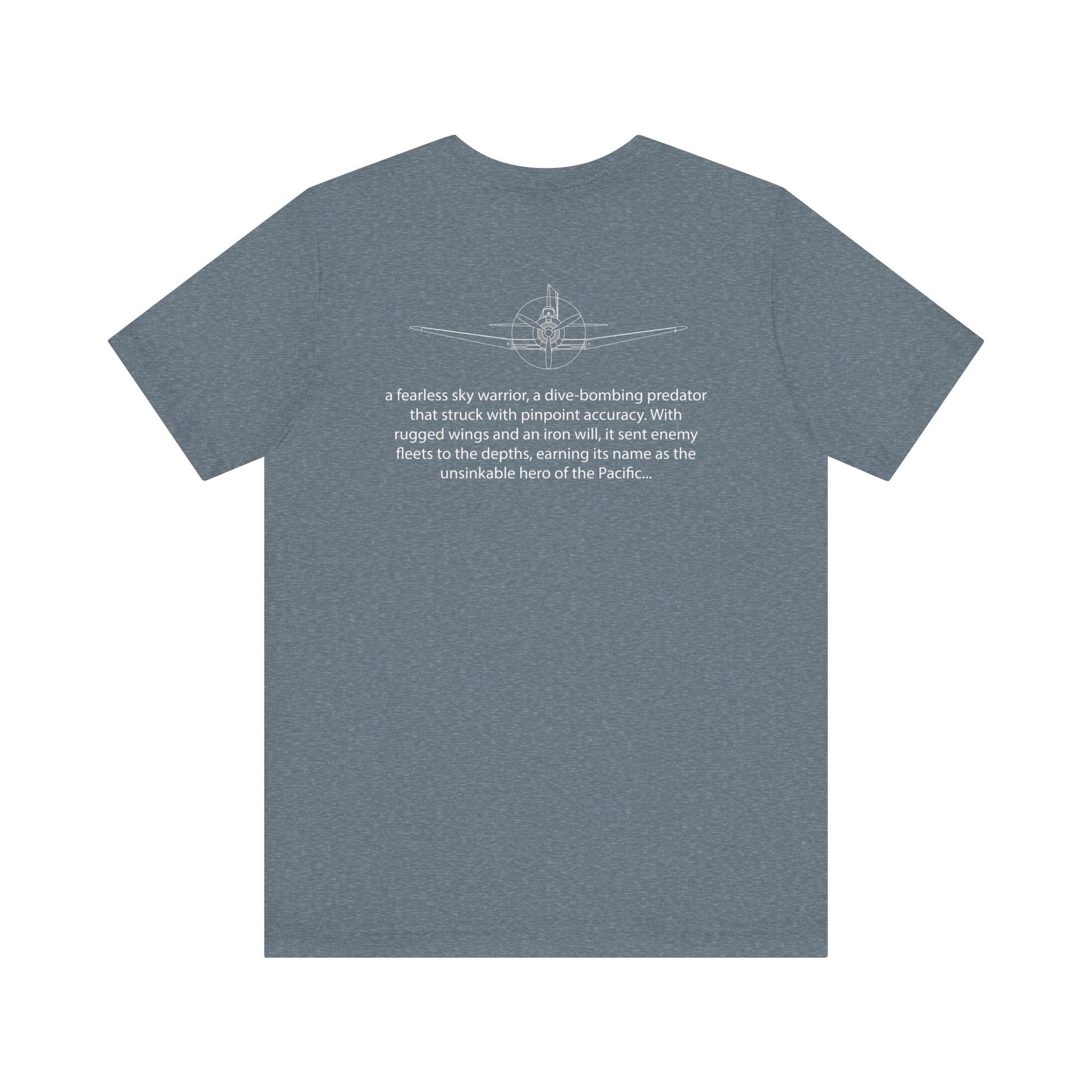 The SBD Dauntless: the dive-bombing daredevil that punched way above its weight. With airbrakes, guts, and a nose for enemy carriers, this WWII warbird turned the tide at Midway and made “dive fast, hit hard, get out” a battle plan. It wasn’t flashy, but it got the job done—dropping bombs with pinpoint precision and bringing pilots home on wings patched more times than a sailor’s uniform. This tee salutes the fearless Dauntless, the little bomber that brought big pain to the Axis fleet. For those who like their history steep, fast, and with a splash of bravery—this one’s for you.