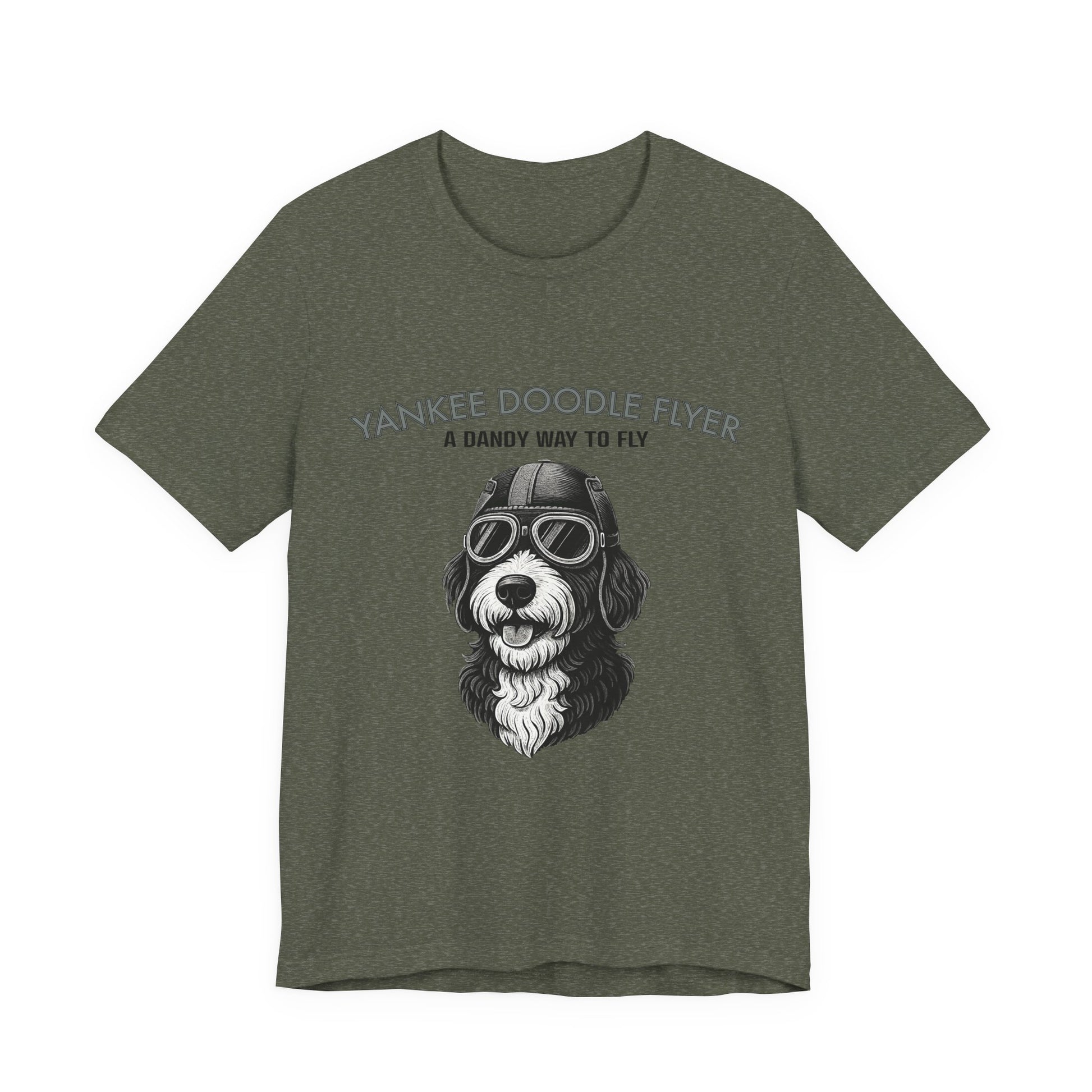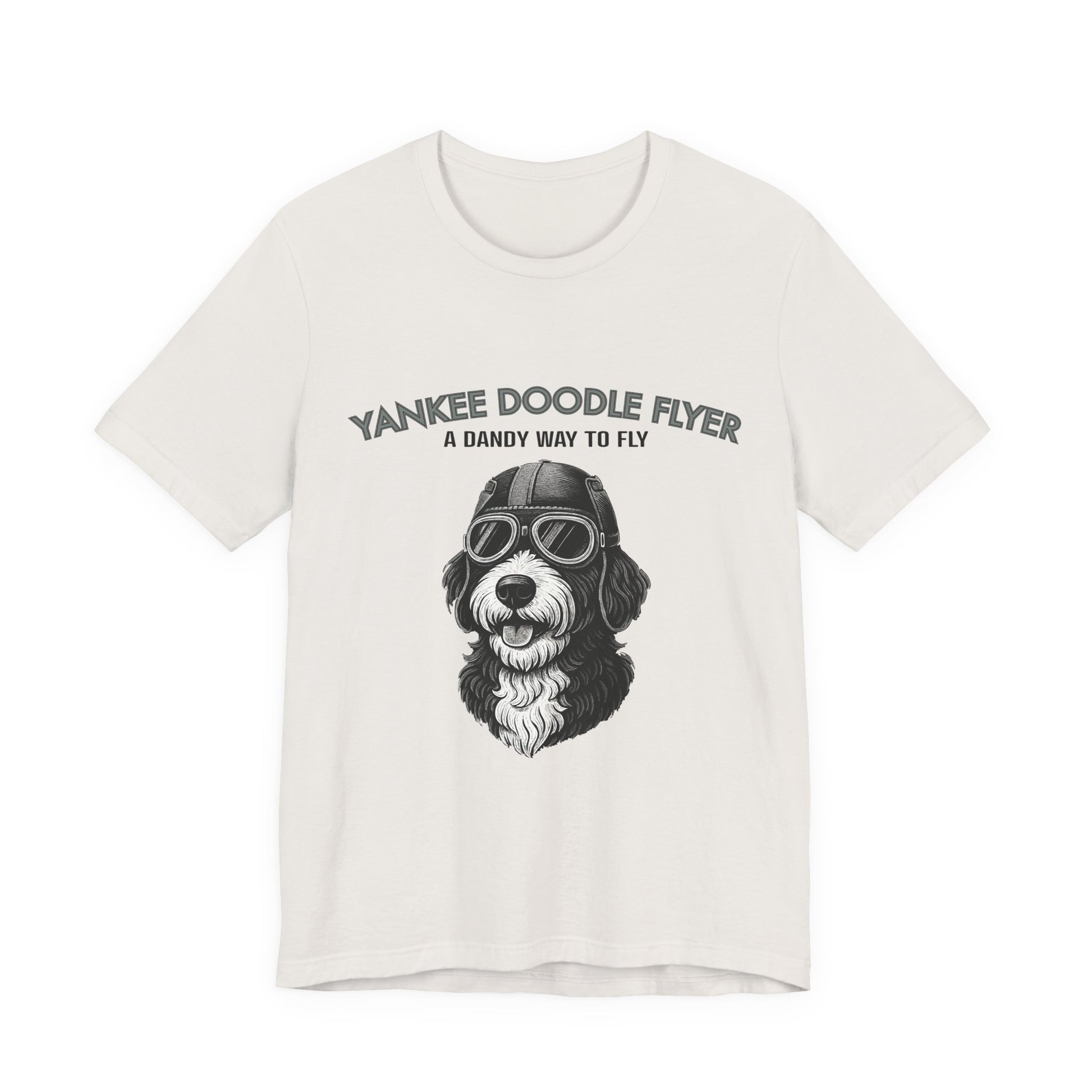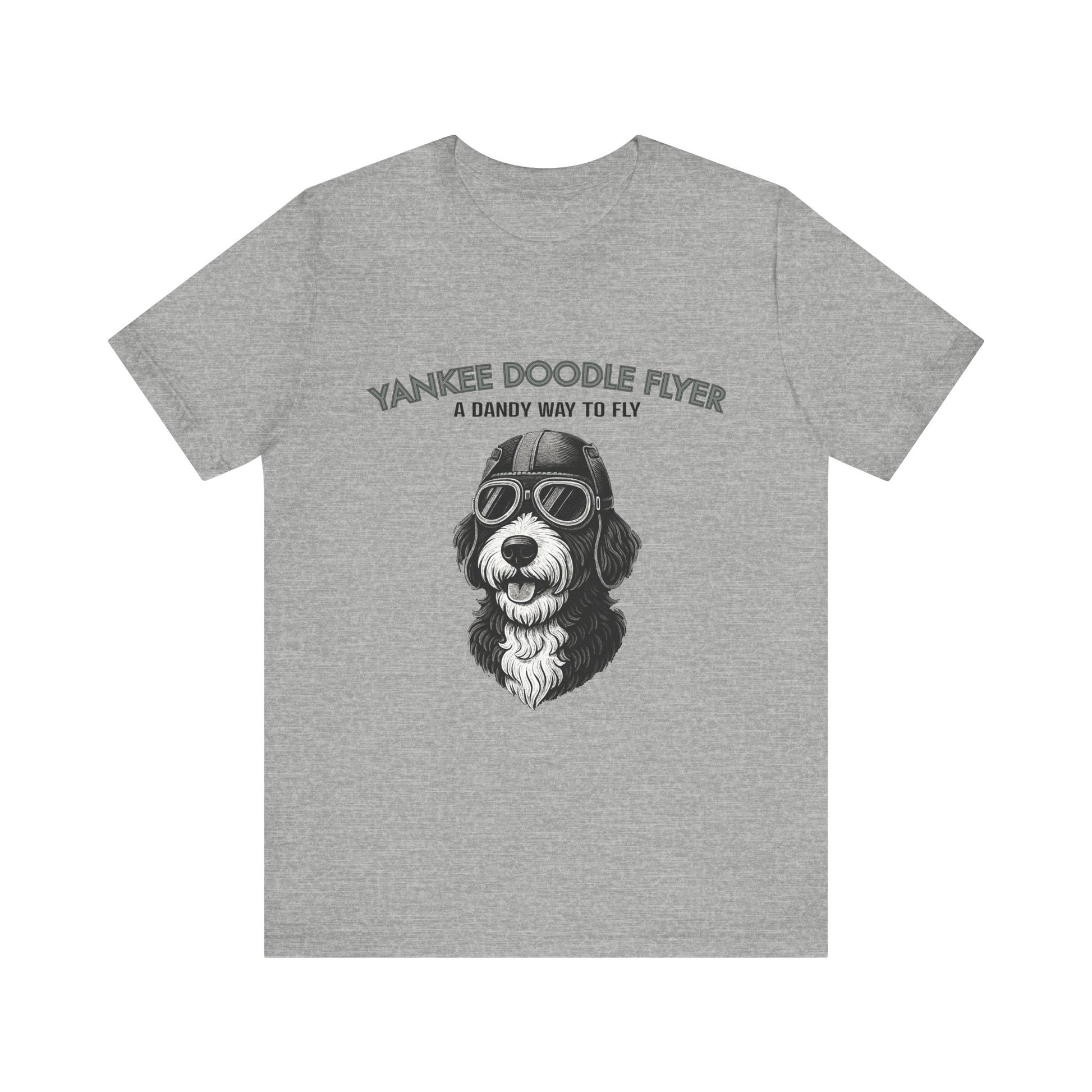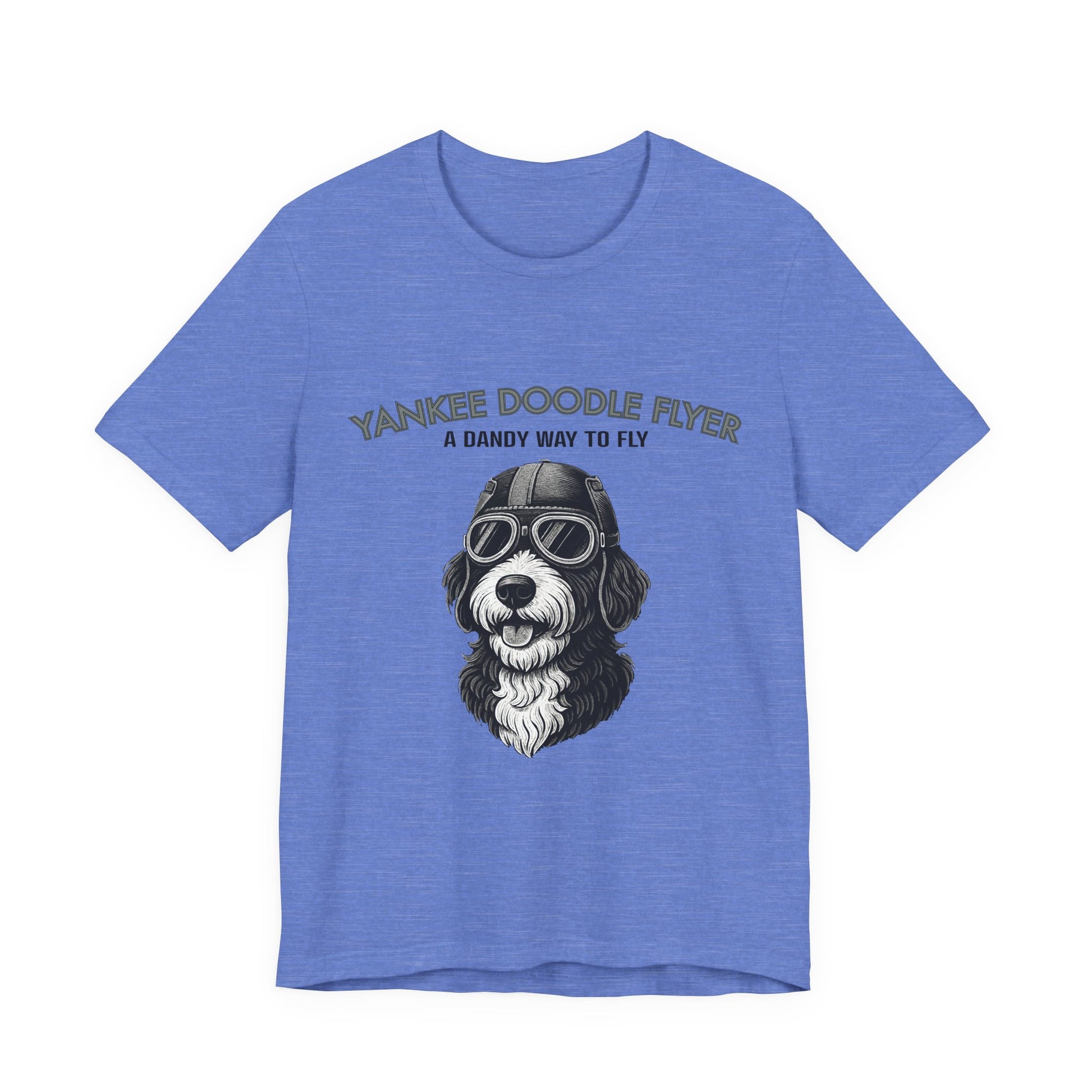 Take off with the Yankee Doodle Flyer—a tribute to four-legged copilots and vintage aviator swagger. This shirt features our aviator Bernedoodle in classic flight goggles and leather cap, ready to chase contrails and fetch horizons. With the slogan “A Dandy Way to Fly,” it’s perfect for dog lovers, aviation buffs, or anyone who knows the sky’s a little better with a co-pilot by your side. Whether you're cruising at altitude or relaxing on the tarmac, this shirt delivers first-class comfort with a playful nod to golden-age flight.
